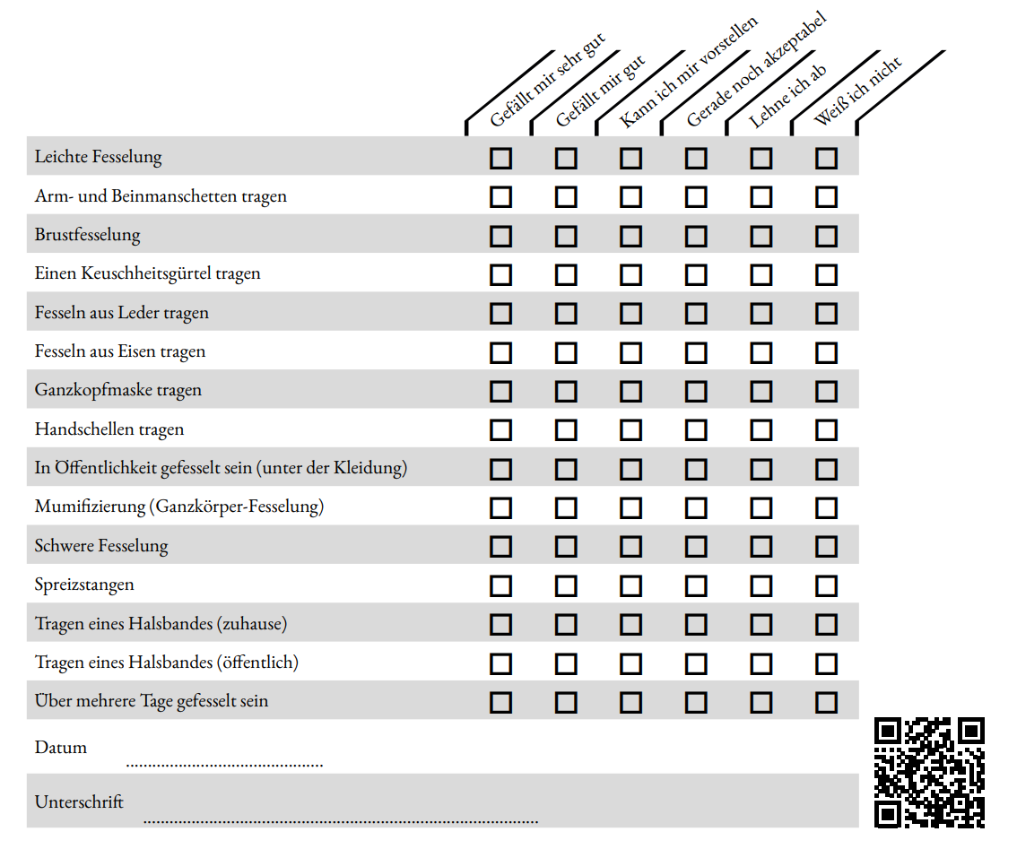 In über 200 Fragen wird die Sklavin ihre Einstellung zu allen Aspekten der SM-Beziehung, ihren Grenzen und ihren Vorlieben beschreiben. Damit kann der Herr gezielter führen und die Sklavin ihren Horizont erweitern.